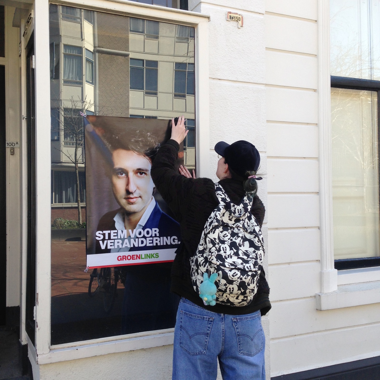 Op 15 maart, de verkiezingsdag, ging ik met Aafke vintage shoppen in Rotterdam. Onderweg kwamen we een loshangende GroenLinks-poster tegen. Dát kan natuurlijk niet!