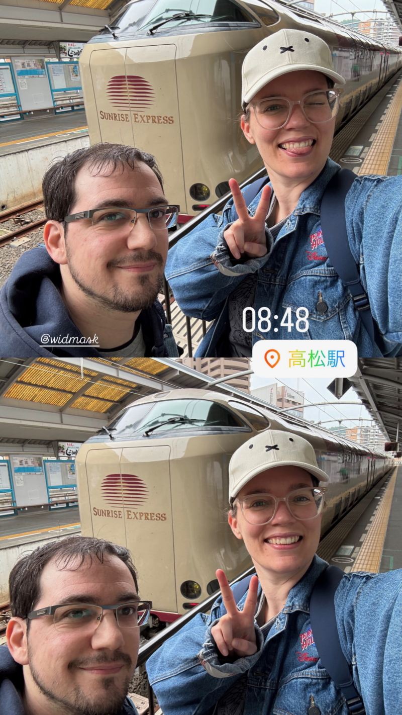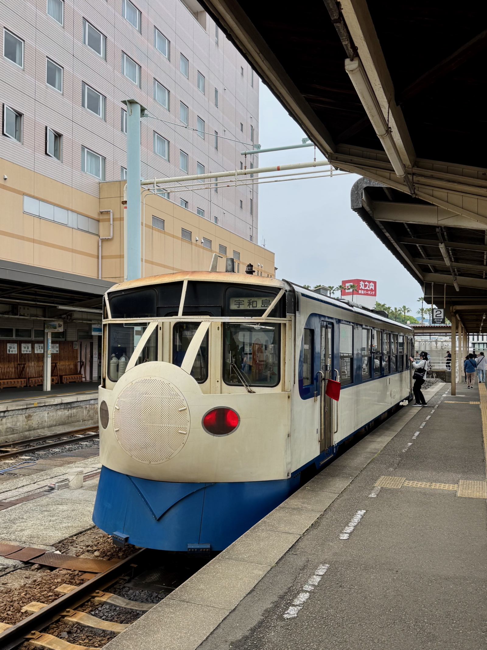 Because yes—speaking of trains—Shikoku is a whole different story from Tokyo. Some trains only run three times a day, like the famously “slowest Shinkansen in the world,” which chugs back and forth between Uwajima and Nakamura. I had really wanted to take this train, but with our tight schedule, a 2.5-hour ride with no toilet felt a bit too risky—missing this train or getting off to pee would disrupt our whole trip. And even then, we still wouldn’t be anywhere near the observatory. Oh well, I thought, guess we’ll have to skip the “Shinkansen”… But then, just as we got off the train in Uwajima and I was waiting on the platform for François—who had gone to the bathroom—it suddenly rolled in!