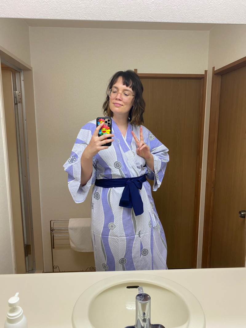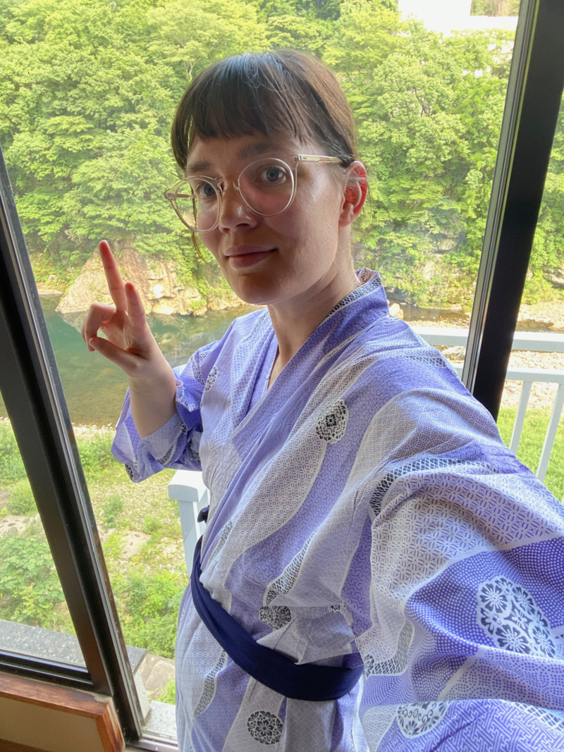 At most onsen resorts, including ours, you get to borrow a yukata (a thin, cotton kimono) when you check in, which you can wear when you go to the bath, as well as during dinner, or when you do karaoke or ping-pong. So everyone does that, and I think it looks so nice!