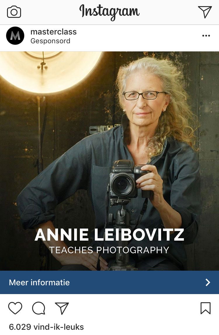 Afijn. Ik was bij Ruud om te helpen schilderen. Mijn grote fotospullen liggen sinds kort bij hem in de studio, dus ik vond het niet meer dan normaal om te helpen met het witten van het plafond. Tijdens het schilderen praatten we over van alles en nogwat. Zo vertelde Ruud dat hij online een video had gekeken, op Masterclass. “Ken je dat?” Ik had er nog nooit van gehoord. “Ja, er staat nu een masterclass op van Annie Leibovitz.” We praatten er uitvoerig over, over hoe zij werkt, hoe topfotografen het aandurven een halve dag en drie reshoots te doen over één foto, terwijl ik dan vaak denk: “Oh help, iedereen zit op mij te wachten! Let’s move on!”