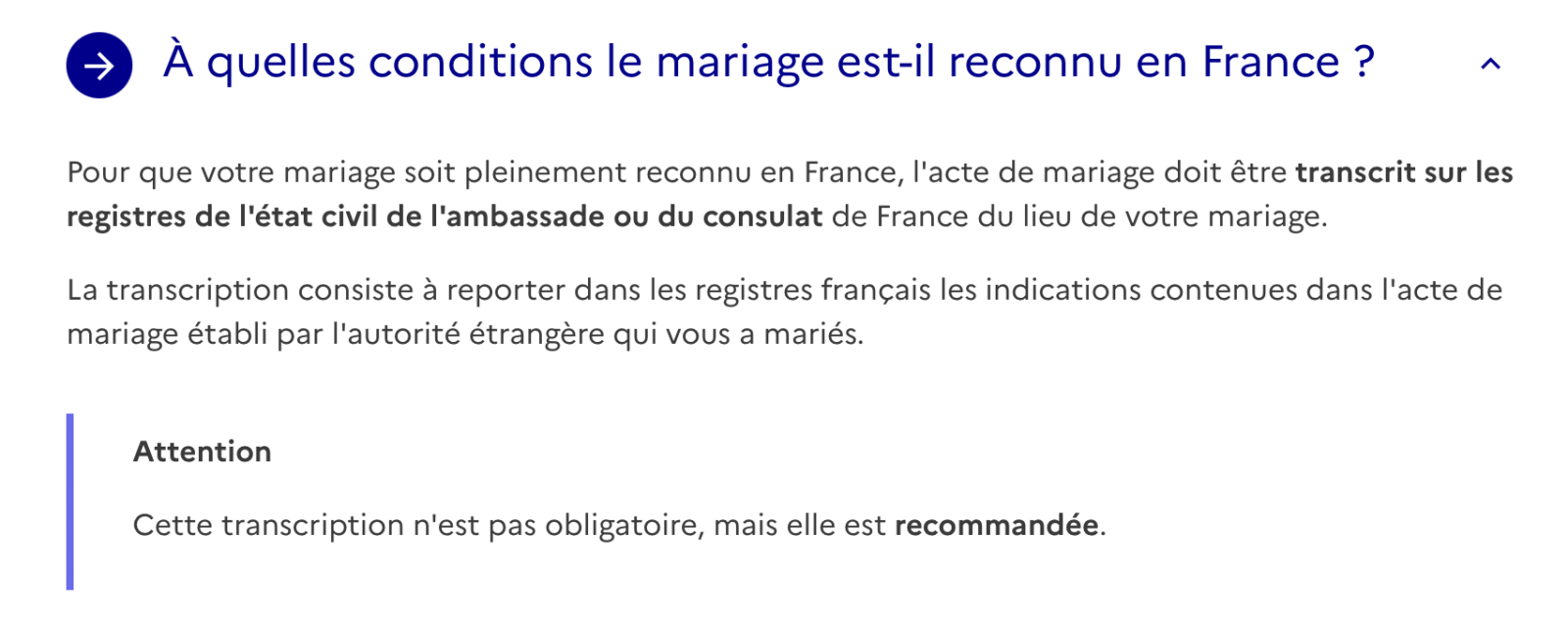 Hey Toeps, ach, wat een stress veroorzaakte dit. Ik zou eerst even goed voor jezelf zorgen. Daarna zou ik aan de slag gaan met de goede ideeën die je zelf hebt. De ambassade weet mogelijk meer. Je kan nog eens langsgaan bij een andere ambtenaar, stuur er desnoods François op af. En als dat niet werkt, zou ik dat inderdaad gewoon toch in orde brengen. Hopemikk is dat dan de laatste hobbel! Wat me technisch opvalt: de website is vaag. Die ‘attention’ is echt verwarrend. Het is niet nodig voor Frankrijk – maar zolang het niet gebeurt, is het huwelijk niet volledig erkend. Als dat nodig is, is net net wel verplicht. Ik ben niet helemaal mee met de Japanse regelgeving 😌 maar ik denk dat het staat of valt met hun eisen. Moet het huwelijk volledig erkend zijn door de orginele staat? Of vragen ze enkel toestemming/bewijs van de ambassade dat jullie legaal ‘huwbaar’ waren? Succes ermee!