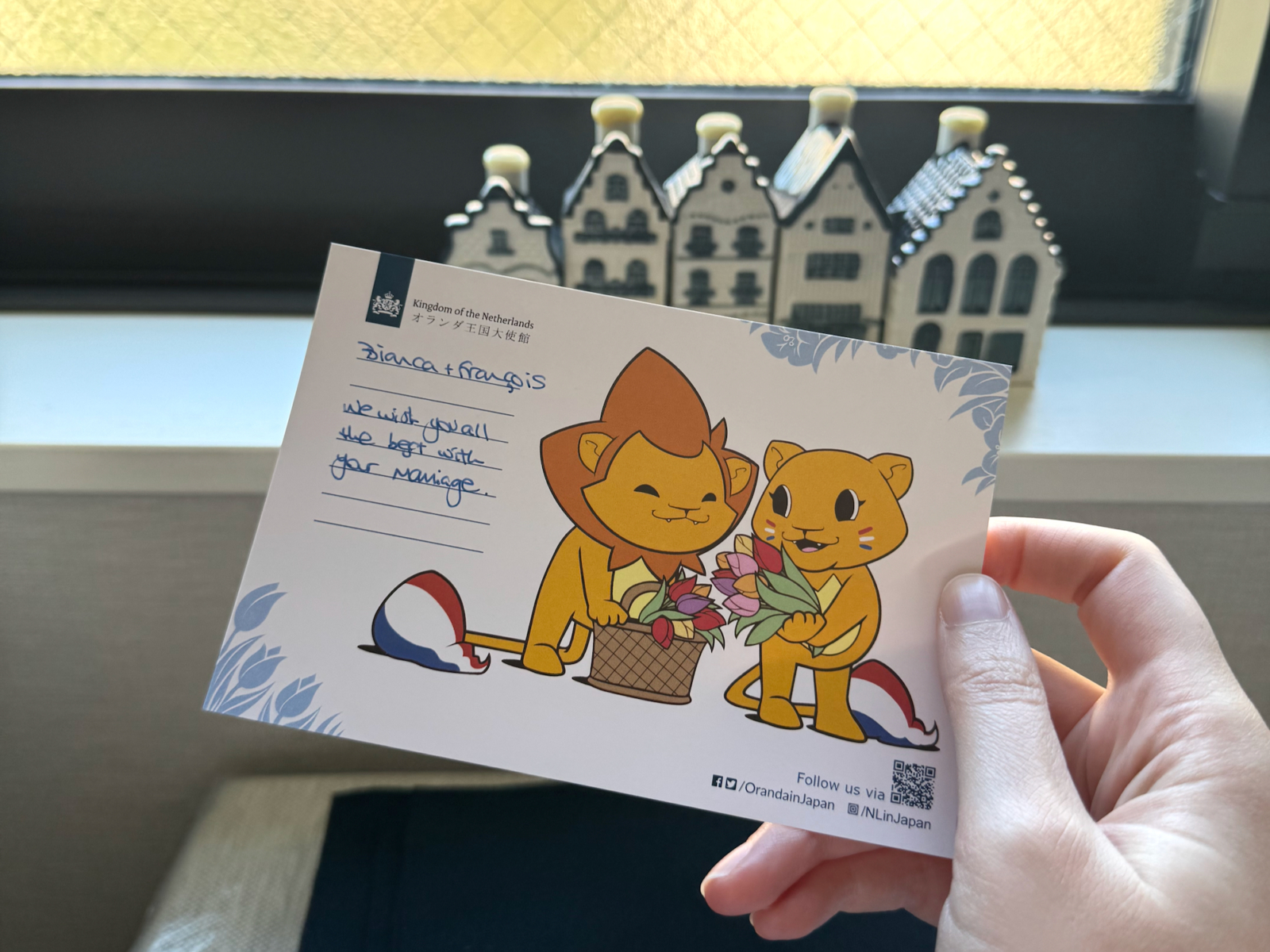 Voor Nederland is het in principe vrij makkelijk. Je mailt de Nederlandse ambassade in Tokio een kopie van je paspoort, een bewijs van inschrijving in Japan (die kan je uitprinten in de convenience store), een uittreksel uit het Register Niet-Ingezetenen (die kan je met online aanvragen met DigiD en wordt per post opgestuurd) en een kopie van het paspoort van je partner. Volgens de website doet de ambassade er dan tien dagen over om deze toestemmingsbrief aan te maken, maar die van mij werd de volgende dag al verzonden, met een schattig kaartje erbij.