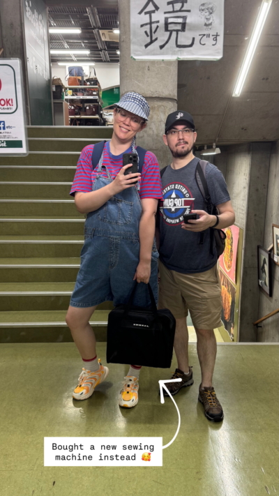 François stond iets voor 12 uur voor de deur. Als eerste brachten we mijn oude, verlepte fiets naar de Hobby-Off die op loopafstand van mijn manshion zit. Ze wilden geen geld geven voor het wrak, maar ik was er wel vanaf. (Normaal gesproken moet je verwijderingsbijdrage betalen, dus dit was beter dan niets.) Daarna deden we een rondje door alle kringlopers die het Ecotown-complex rijk is. Ik vond een tweedehands naaimachine die aan al mijn eisen voldeed: goedkoop, simpel, met voetpedaal, stevig… En toen ik zag dat er ook nog een grote verlengtafel bij zat, was ik verkocht! Het ding was 5500 yen (32 euro) en er zit drie maanden garantie op. De naaimachine die ik eerder kocht, was bijna kinderspeelgoed. Als deze nieuwe machine naar behoren werkt, dan is het een perfecte upgrade. Een perfect verjaardagskado. We aten een crêpe bij het kraampje naast Ecotown, en ik zeulde de zware mishin naar huis. Het was inmiddels half vijf, tijd om richting zwembad te gaan!