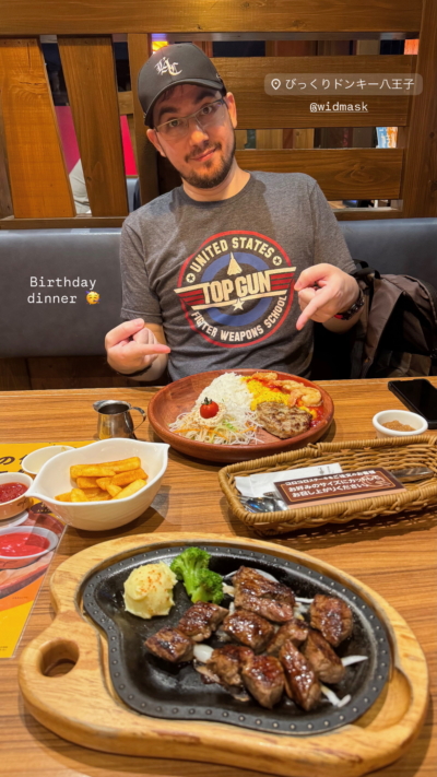 Bikkuri Donki, ofwel “Verbaasde/Verrassende Ezel”, is een familierestaurant dat burgers (hanbaagu, zonder broodje — niet te verwarren met hanbaagaa, mét broodje), steak en andere “Westerse” gerechten serveert. Het interieur heeft een country vibe en er rijden van die katachtige serveer-robots rond. François’ vrienden gingen deze week met hun respectievelijke vriendinnetjes naar luxe, Franse restaurants op boten en in hoge torens, maar wij hadden de fijnste dagafsluiting bij de maffe ezel. Net als vroeger. Hierna liep François naar het station, en ik terug naar mijn crib: de volgende ochtend had ik les, dus ik kon beter in Hachioji blijven.
