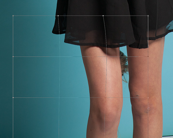 Eerst koppel ik de laag even los van het masker. Anders schuift dat masker net zo hard mee, en dat moet natuurlijk niet. Vervolgens selecteer in een stuk achtergrond plus been, en gebruik ik de warp-tool.