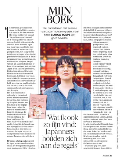 Over haar avontuur schreef ze het boek Deze autist ging naar Japan. “Als autist ben ik overal wat ongemakkelijk en onhandig. In Japan denken ze dan al heel gauw: die weet gewoon niet hoe het hier werkt, want het is een buitenlander. In Nederland vinden ze me sneller bot en onaangepast.”