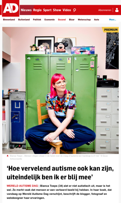 Schrijver en fotograaf Bianca Toeps (36) schreef twee boeken over haar autisme: Maar je ziet er helemaal niet autistisch uit en Ik ben autastisch! Er zijn nog veel misverstanden over autisme. Vooral over vrouwen met autisme is er een hoop onwetendheid. “Ze krijgen veel vaker een verkeerde diagnose dan mannen.”