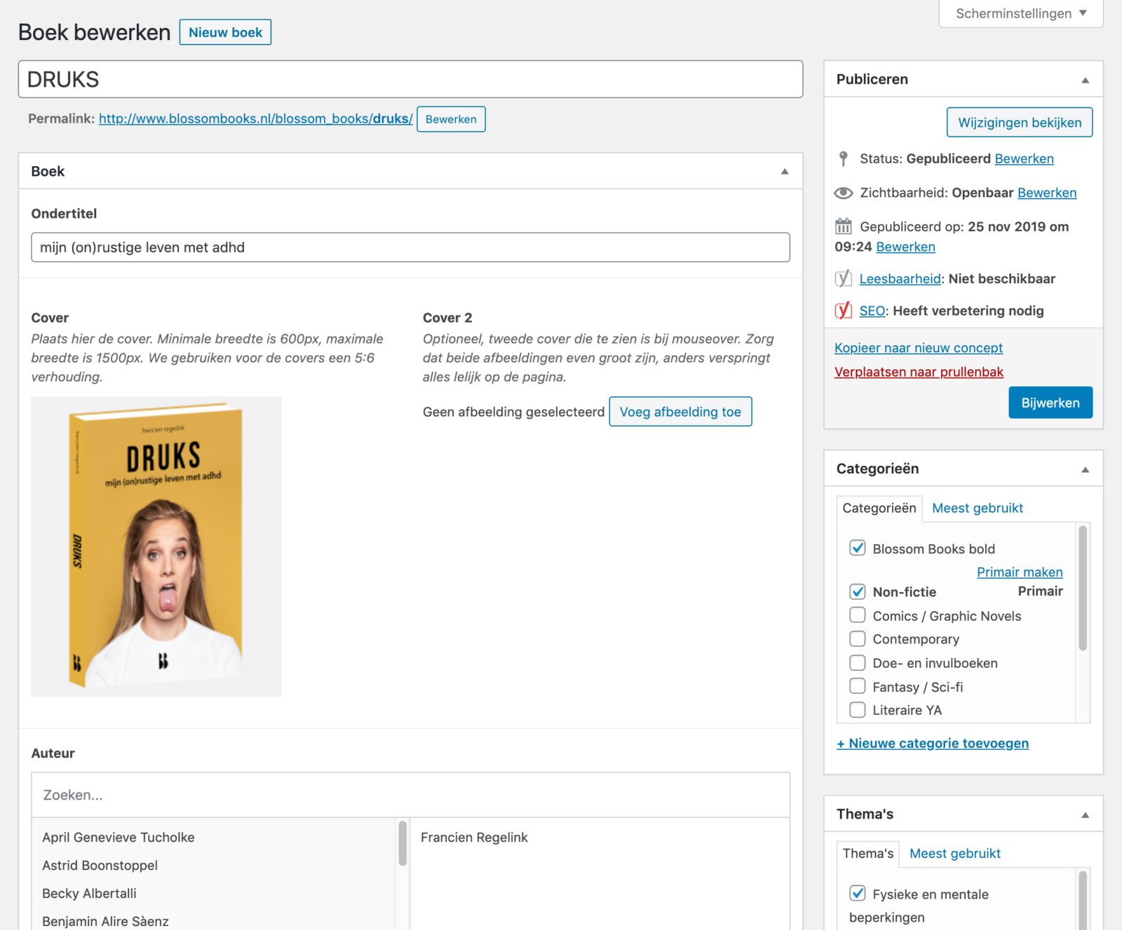Wanneer een boek in twee edities is uitgebracht, kan er een alternatieve cover worden toegevoegd, die te zien is als de gebruiker met de muis over de afbeelding gaat. Onderin zie je ook het veld om de schrijver(s) te koppelen, en rechts zie je de categorieën en thema’s.