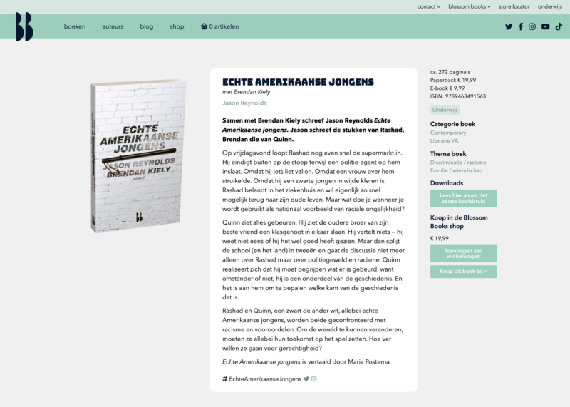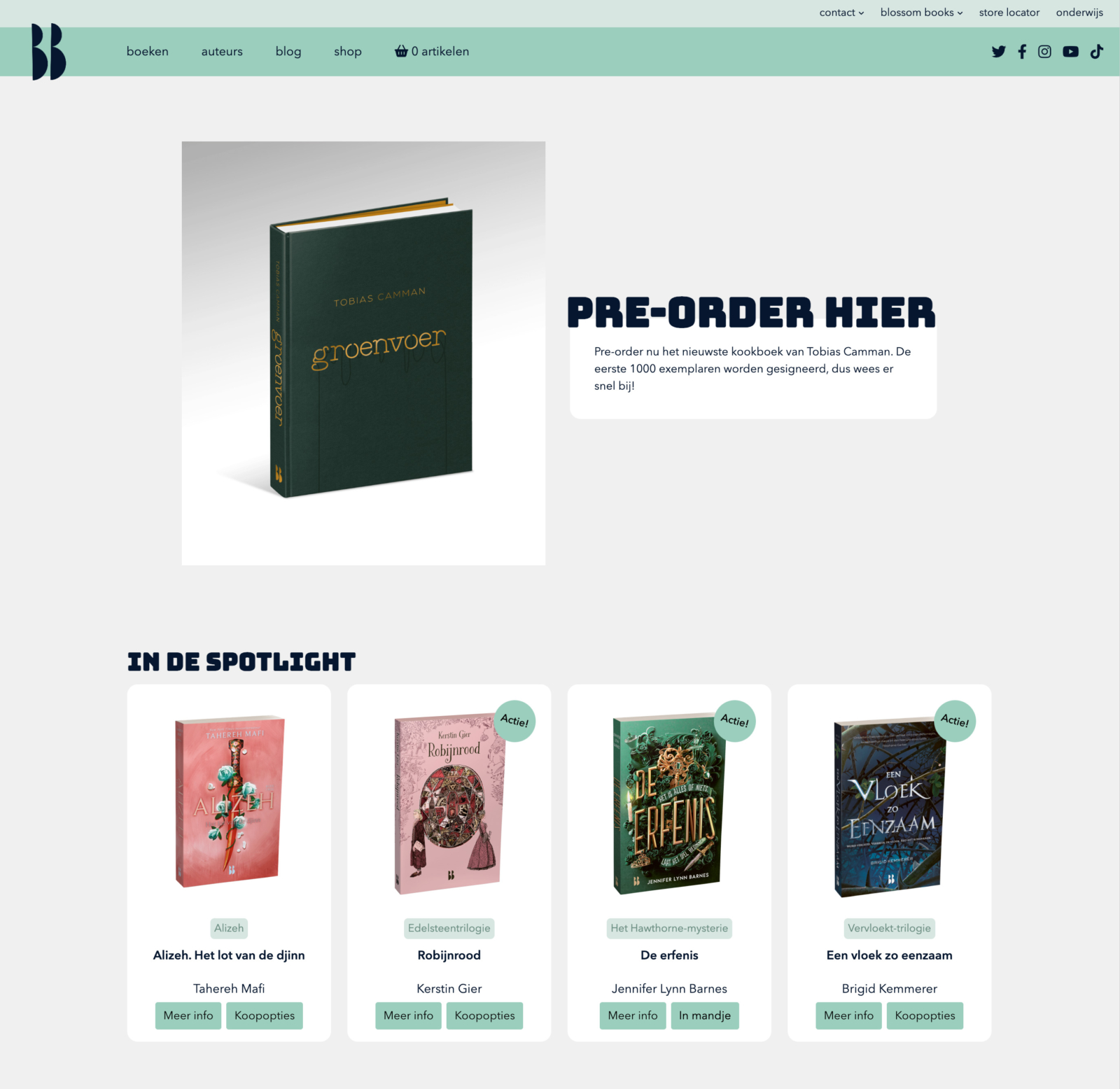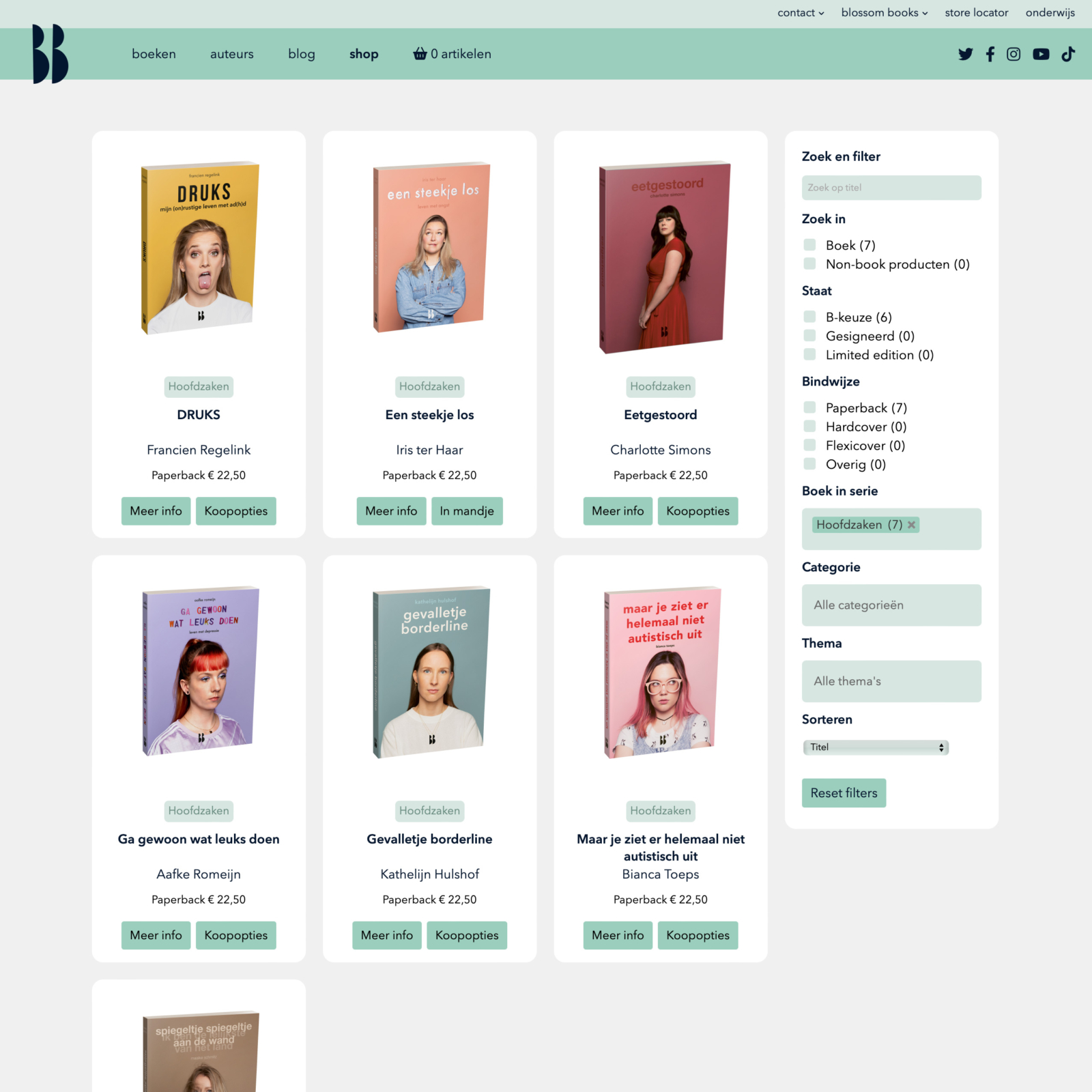 Voor Blossom Books bouwde ik een website met een boekenarchief dat automatisch gekoppeld is aan de auteurs, een webshop, en een speciale onderwijspagina met extra informatie. Ook heeft de uitgeverij een blog, waarop ze regelmatig acties en nieuwtjes delen.