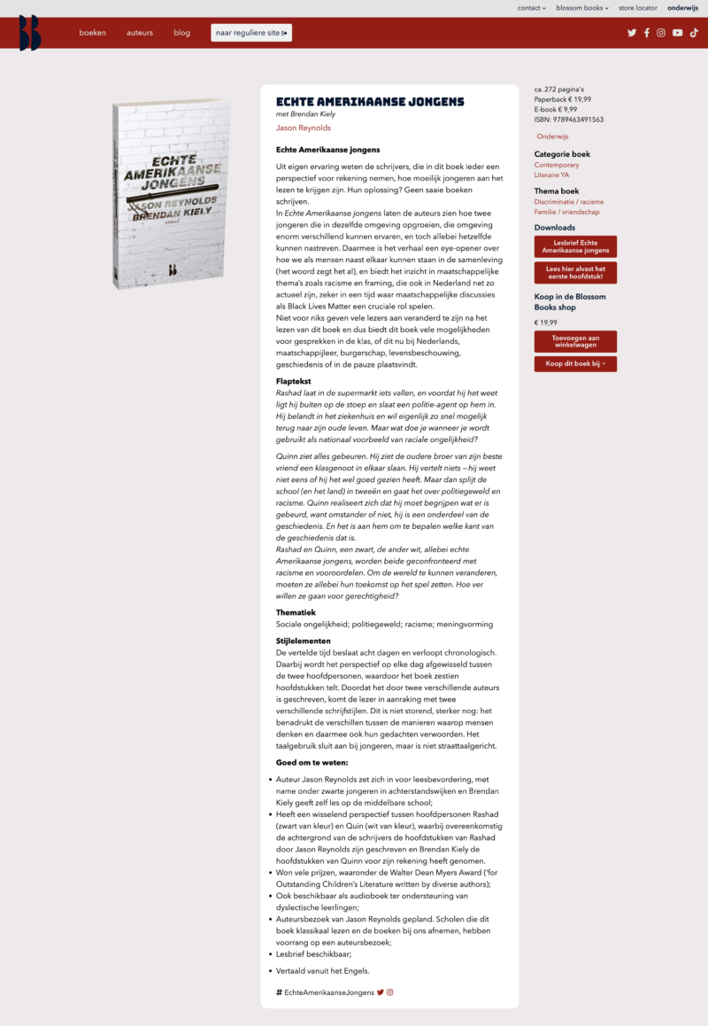 Lezen op school moet, maar als het dan toch moet, laat het dan in ieder geval leuk zijn! Blossom Books wilde een onderwijswebsite waarop docenten kunnen zoeken naar thema’s die hun leerlingen zullen aanspreken. Ook de homepage en blogs op dit onderdeel van de website zijn anders. Maar dat wordt allemaal al snel duidelijk, want de steunkleur van het onderwijsgedeelte is niet mintgroen, maar donkerrood.